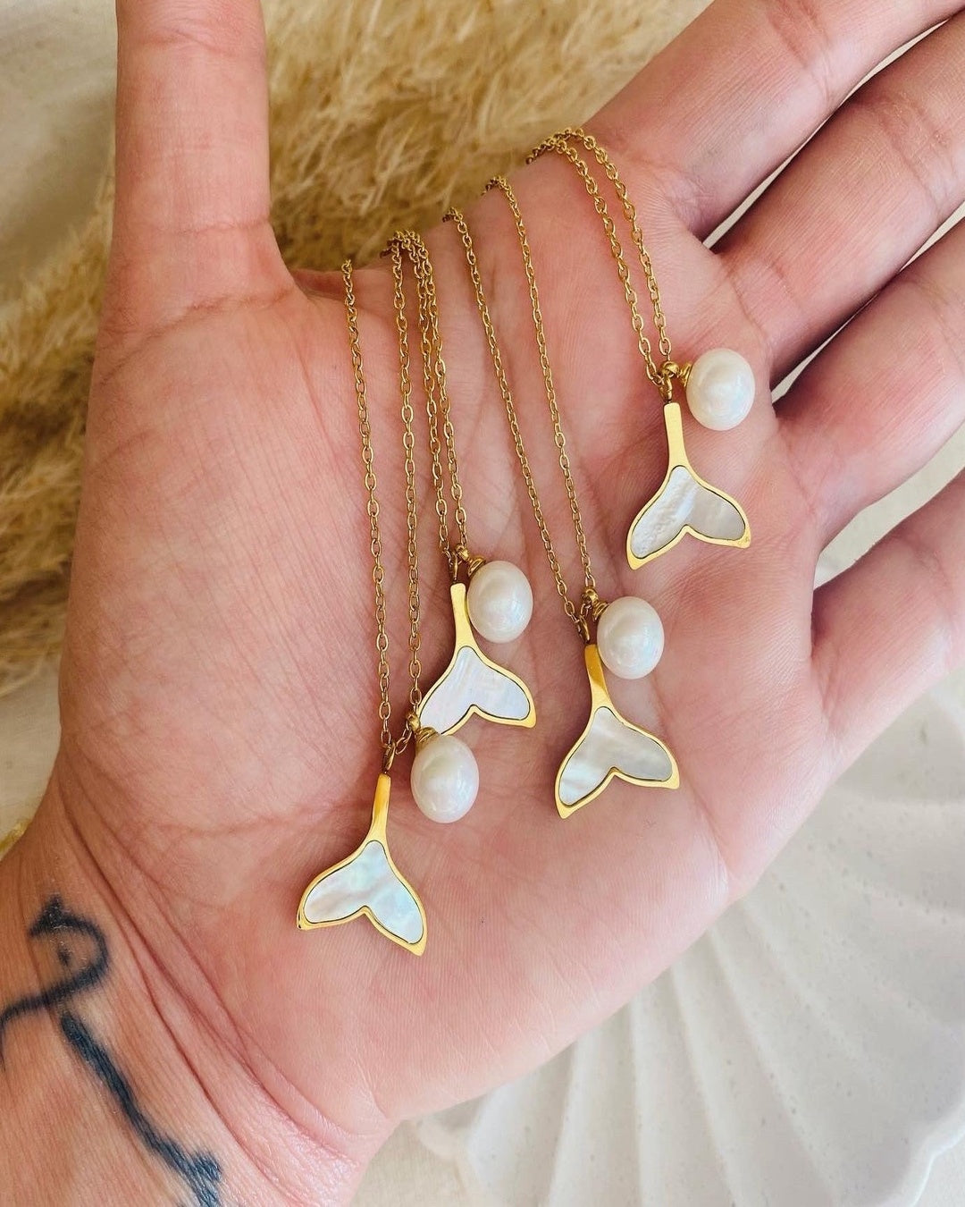 Collar Cola de Ballena en Madre perla y perla colgante en acero inoxidable ideal para llevar el mar contigo.