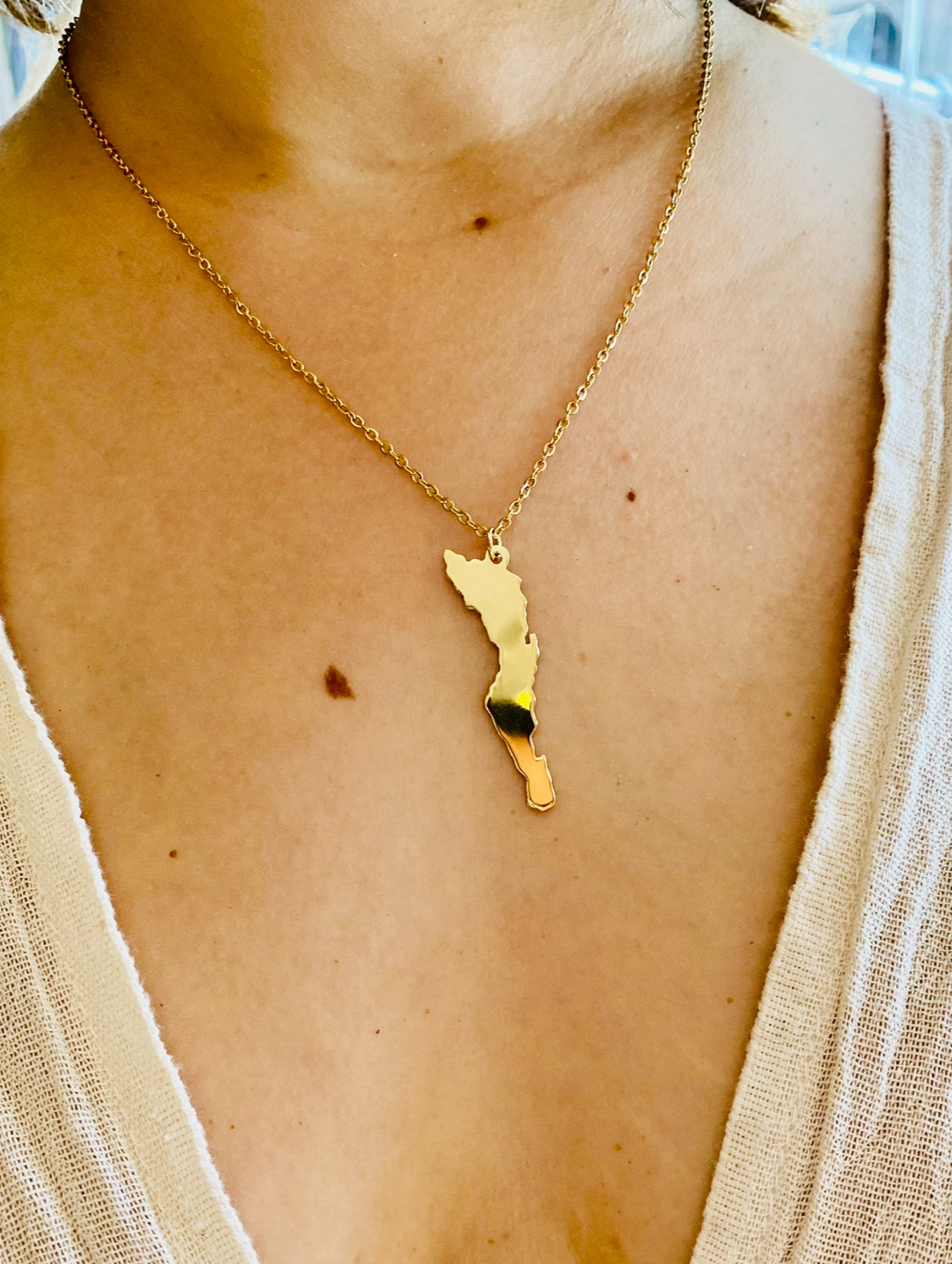 Lleva contigo tu Baja Inspirada en la magia del mar y el desierto de Baja California Sur , esta pieza es mas que un accesorio, es un simbolo de identidad, conexion y elegancia. Elaborada artesanbalmente en Mexico en oro laminado de 22 K  Medidas: Baja península 3.5 cms Cadena 45...